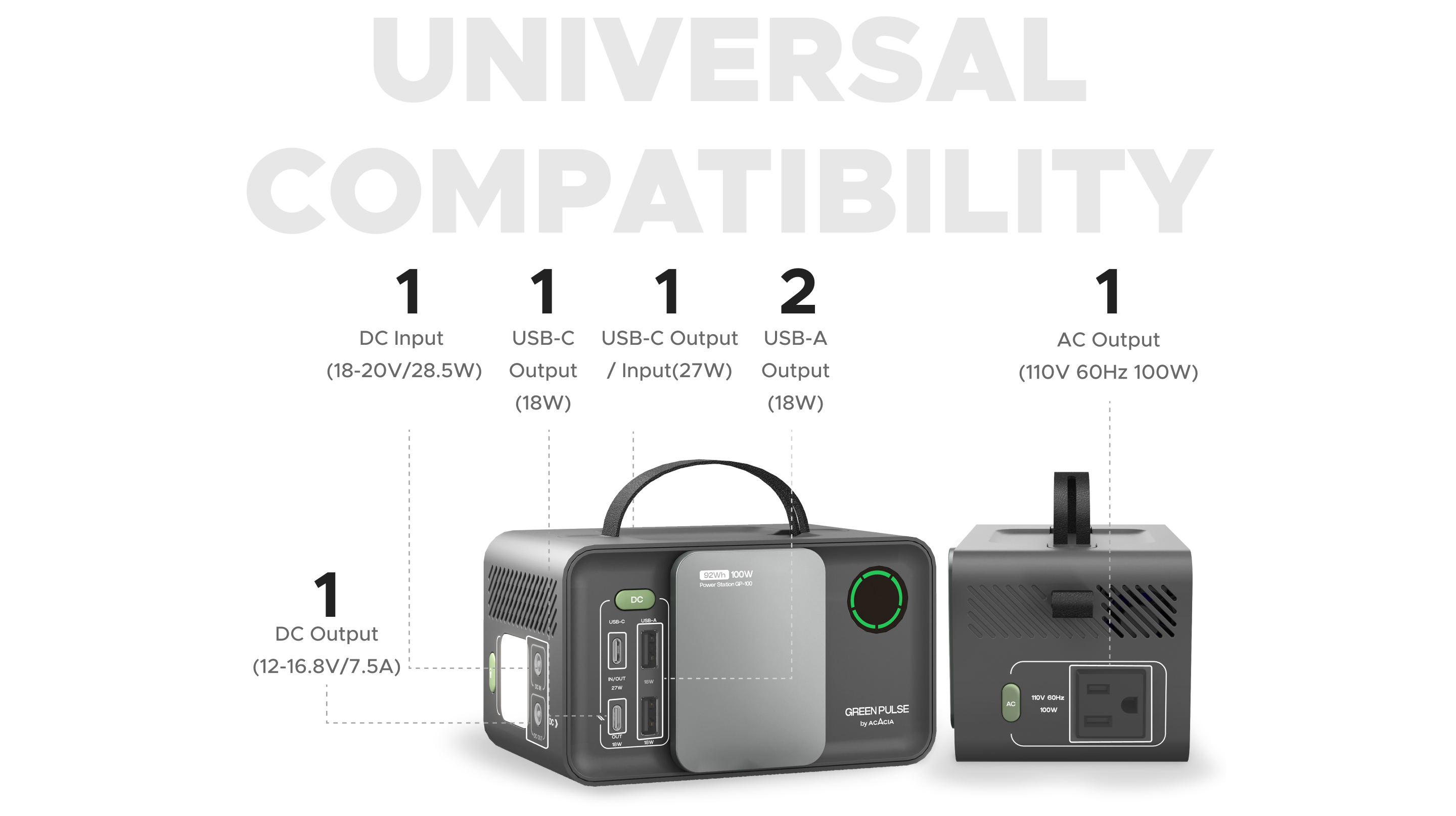 Experience versatility with the Acacia 100W Power Station, providing a range of outputs including AC, DC, and USB to charge your devices wherever and whenever you need.
