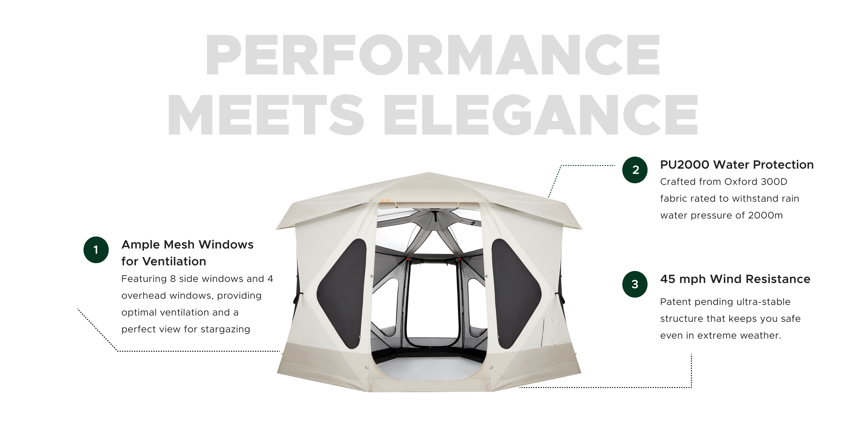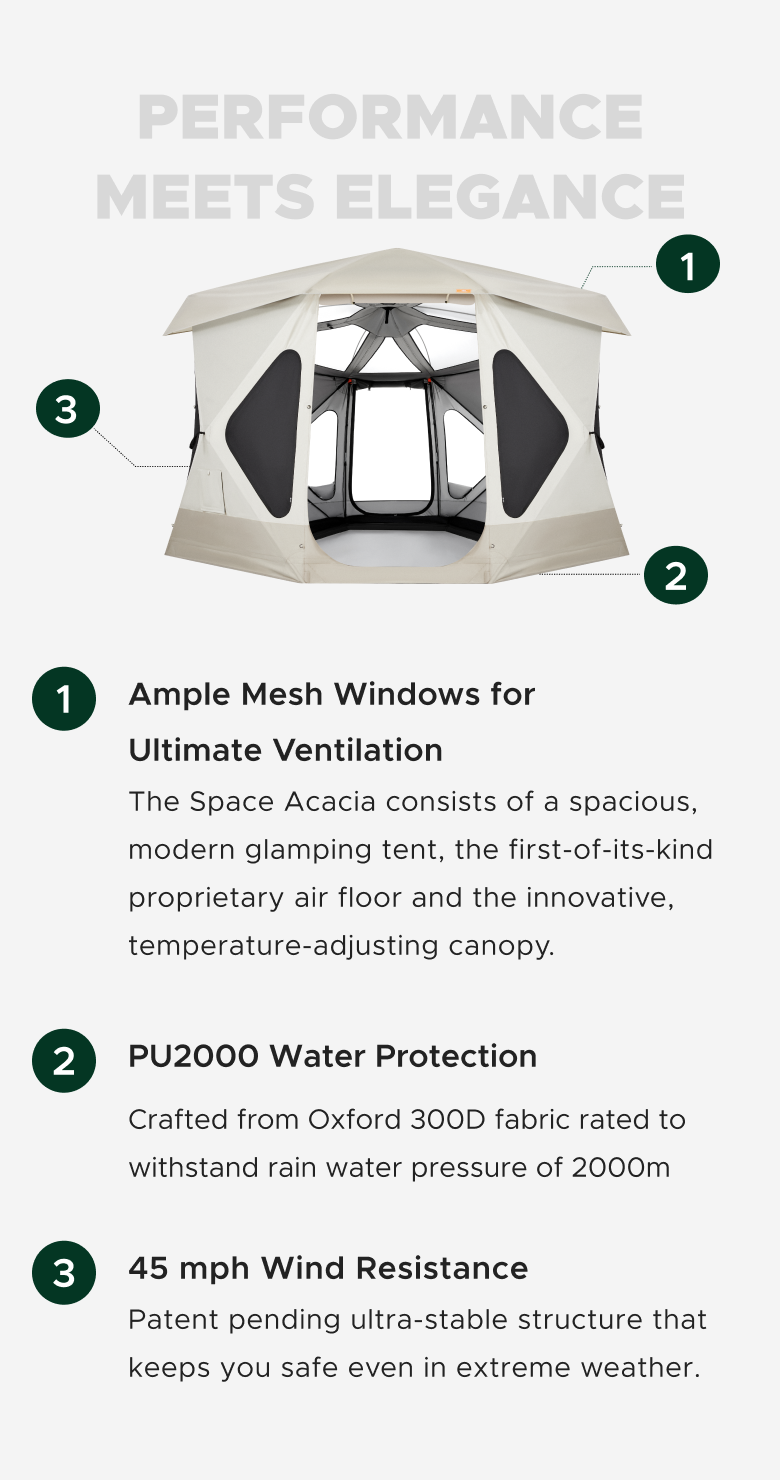 Discover the simplicity of outdoor living with Space Acacia's pop-up design. With just a few pulls, the Acacia tent effortlessly pops into shape, preparing you for your next adventure in under 5 minutes.
