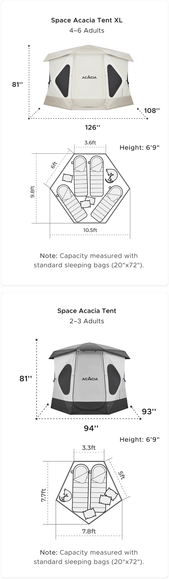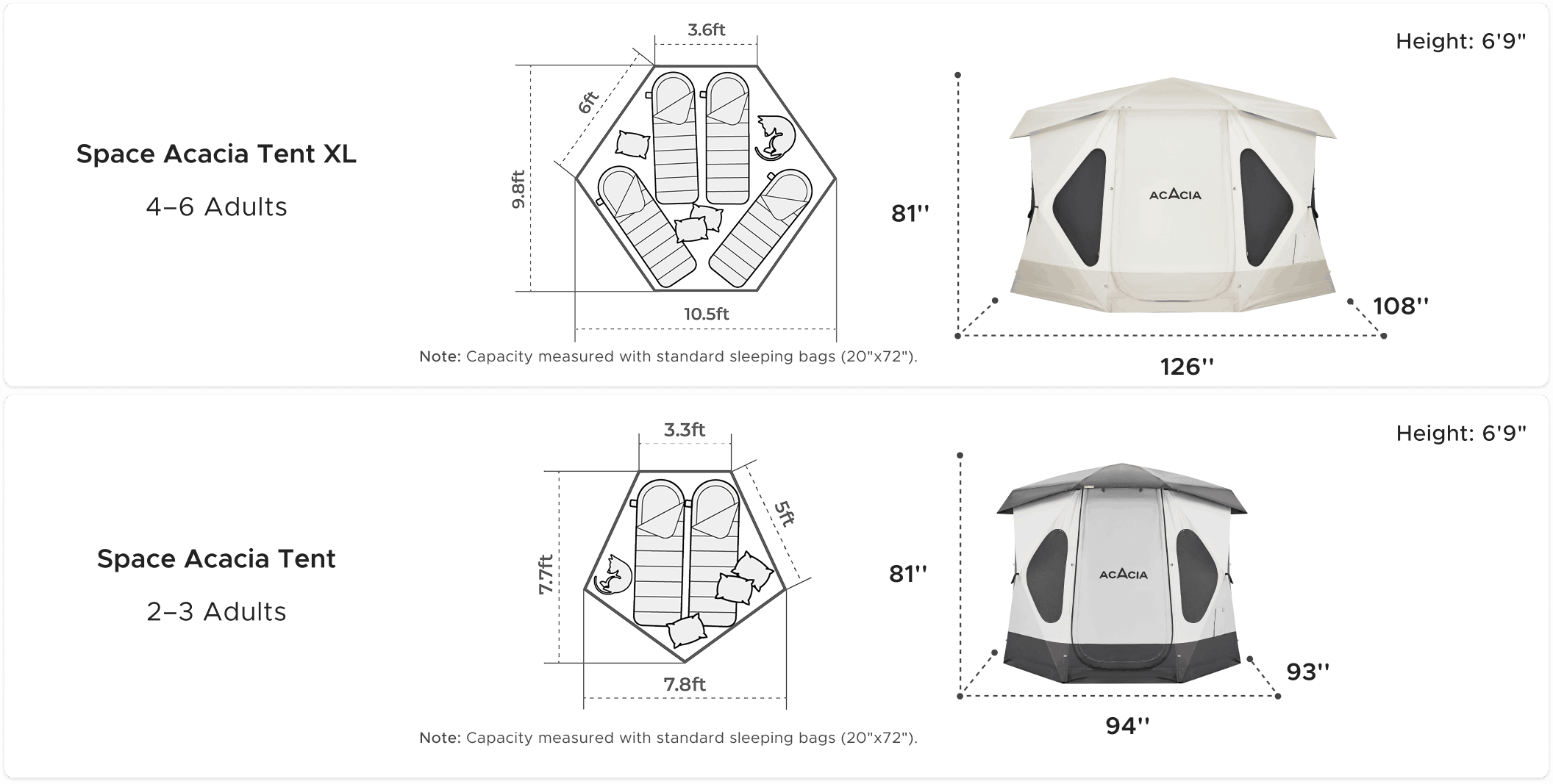 Space Acacia gives 2 people plenty of room. Bringing the whole family? Space Acacia XL provides a comfortable space for up to 4-6 people.